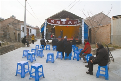 1月29日,村里一位去世的老人入土安葬的前一天,家人请来秦腔剧团前来唱戏演奏,但观众寥寥。