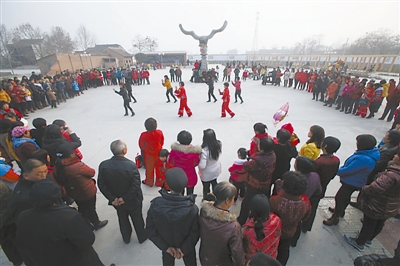 1月31日,村民在村口的文化广场跳舞,无论表演者还是观众,基本都是老人、妇女和小孩。