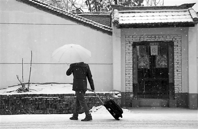 春节长假结束。陕西宝鸡,一位年轻人拖着行李冒雪离家出行。 本报记者 杨登峰 摄