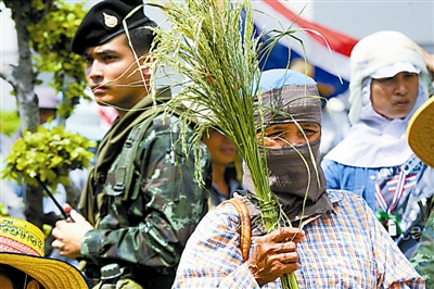 2月17日,在泰国看守总理英拉办公的国防部次长办公楼门口,一名稻农手持水稻抗议。当日,数百名来自泰国各地的稻农冲进办公楼院内集会示威,要求与英拉见面并质问何时才能归还欠款。看守政府此前承诺将于17日开始偿还亏欠稻农的大米收购项目应付大米款,但现场示威的稻农表示并未收到欠款。