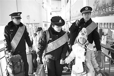 库尔勒铁路警方针对日前辖区返程客流激增的现状,开展了“铁警保安全 温暖回家路 ”为主题的便民、利民、惠民活动。图为铁警护送小学生安全乘车。(孙婉茹 许荔)