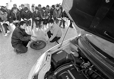下图:2月19日,在一个汽车修理培训班的实习车间内,教员在传授汽车维修技术。