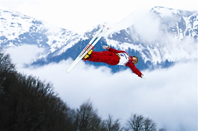 蓝天白云,青山草地,运动员与大自然和谐相拥,冬奥会有其独有的魅力。图为自由式滑雪男子空中技巧比赛瞬间。 CFP供图