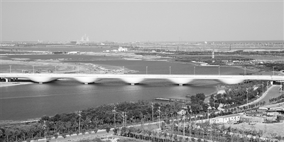 由中铁十八局五公司承建的国内首座采用鱼腹式变截面箱梁结构桥——天津生态城蓟运河故道桥在2012年荣获中国市政工程金杯奖后,于日前又获国家优质工程银奖。该桥由法国咨询公司以“漂浮”为理念设计,全长925米,主桥长297米,分六跨,最大跨径为54米,总投资2.2亿元,是国内首座采用鱼腹式变截面箱梁结构形式的桥梁。龙艳 摄