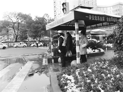 2月19日,大雪。湖南怀化市在市区10多个交通十字路口处,搭建起50多个“雪天候灯区”,下雪下雨天方便行人候灯,又有利于交通秩序,成了怀化冰天雪地里一个个“暖点”,一个个亮丽风景点,在当地传为美谈。行人赞不绝口:“雪中送炭,雨中送伞。”薛题泰 摄
