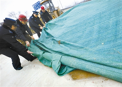 2月21日,执法人员在一处工地内对露天堆放的沙土进行遮盖处理。