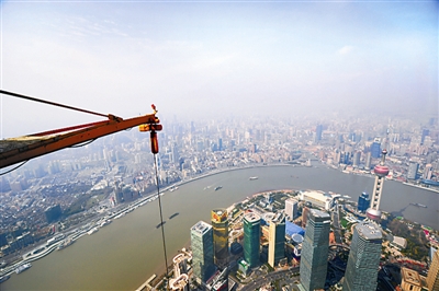 这是2月22日从580米高的上海中心大厦上拍摄的上海浦东陆家嘴俯瞰图。