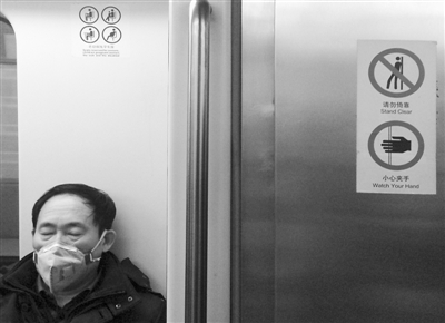 2月21日,北京地铁内一戴口罩的乘客。本报记者杨登峰摄