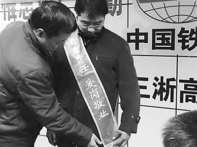 日前,在中铁十一局四公司三淅项目部举行的“看重责任,爱岗敬业先进典型报告会”上,爱岗敬业先进典型、财务部长刘金克(左)给爱岗敬业先进典型、试验室主任陈亮(右)戴带授带。(郑传海 摄)
