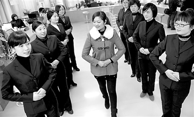 2月25日,合肥市丁香社区工作人员在老师的指导下学习站姿礼仪。