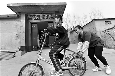 李岩工余时间在家门口帮助儿子李龙坤学习骑自行车。董乃德 摄 (新华社发)