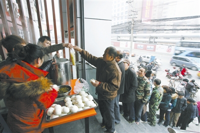 2月26日9时许,西安马路劳务市场边的一家火锅店发放免费早餐,正在此处等活的农民工们排队领取热气腾腾的馒头和稀饭。一个夹着咸菜的馒头、一袋小米稀饭给这些寒风中揽活的农民工带来了温暖。