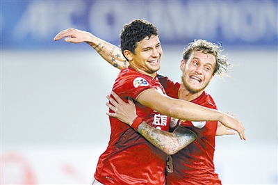 广州恒大队新援迪亚曼蒂(右)与队友埃尔克森庆祝进球。