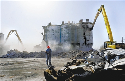 此举进一步加大了对大气污染防治的力度,缓解了北京周边地区的空气污染程度。图为三河市一家水泥企业被拆除现场。