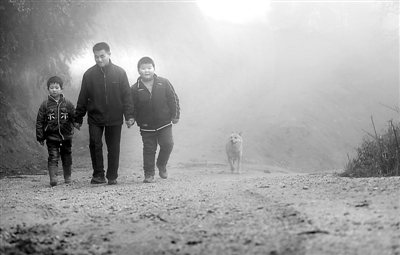 2月26日,张如兴(中)和学生郑开军(左)、张建伟走在放学路上。7岁的郑开军和8岁的张建伟是村中的留守儿童,平日里在张如兴家中吃住。
