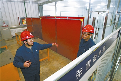 2月25日,张雪松(图左)和李玉璐在一起商量“创新工作室”的前景。