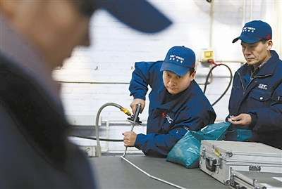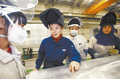 “我就是在这个厂区出生、上学、结婚,接触的都是唐车人。初中上的技校,能像爷爷和父亲一样到厂里工作是我小时候的愿望。”孙斌斌很喜欢现在的工作,觉得焊接是种享受,“你用电焊把冷冰冰的钢铁焊接在一起,焊出漂亮的波纹,就像在做一件艺术品。”艺术品是美丽的,但制作的过程却不轻松。“焊接现场烟雾缭绕,环境嘈杂,还要小心不被焊花烫着,一年四季都得全副武装,捂得严严实实分不清男女。”如今的孙斌斌已不在焊接一线劳作,但她比以前更忙了。她曾被派往德国深造,学成归国后成为了厂里的培训老师,奔走于各个培训点。2月25日,记者见到她的时候,她刚刚从辽宁出差归来。
