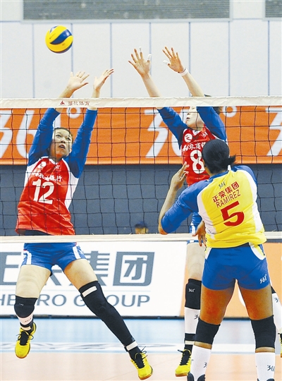 年轻的浙江女排(图中拦网者)表现出难得的沉稳和冲击力。CFP供图