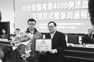 贵州的90后侗族青年医学生邓秀军于2014年2月27日在解放军307医院向一名白血病患者捐献了造血干细胞,成为中华骨髓库第4000名造血干细胞捐献者,(图为)中国红十字会会长华建敏向他颁发“捐献造血干细胞荣誉证书”。