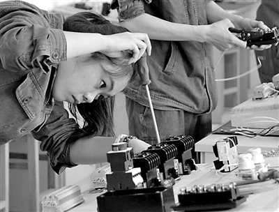 图为电气选手正在参加安装点动与连续控制电路的比赛。朱延州 摄