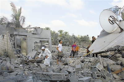 7月8日,在加沙地带南部城市汗尤尼斯,巴勒斯坦人检查在当天凌晨遭到以军轰炸的楼房废墟。