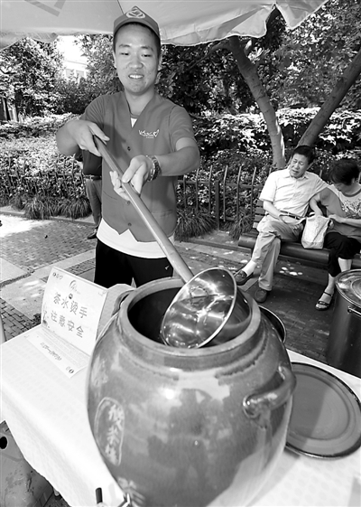 7月9日,一位志愿者在向凉茶桶里添加龙井茶。