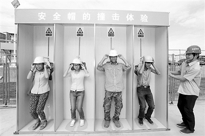 7月5日,乌鲁木齐一家施工企业的建筑工人正在进行安全帽的撞击体验。