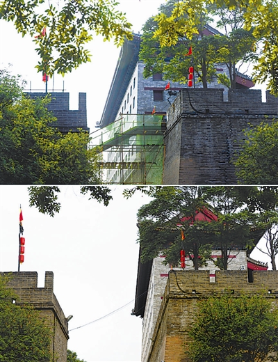 上图为7月6日拍摄的西安城墙电梯施工现场,下图为7月10日拍摄的恢复原貌的城墙。