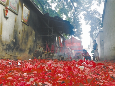 被神化了的毛中古树下,祭拜的家长络绎不绝,燃放的鞭炮纸屑厚厚铺满一地。