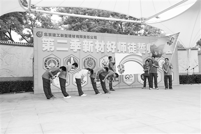 7月4日,北京万芳亭公园文化广场,来自北京建工新材公司的 16个学员团队向自己的师傅当众行拜师礼,拉开了“新材好师徒”第二季的序幕。该活动不仅符合员工成长发展的现实需要,更为企业长远发展做好人才储备,成为凝聚人心、提升素质、汇聚发展正能量,实现企业科学发展的有力之举。张苓 摄