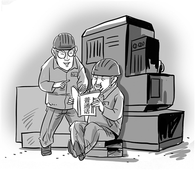听不懂师傅们说话,怎么能学好技术呢?跟师傅学他们的家乡话?不行,学他们的家乡话估计要好几个月,师傅还不一定愿意教!要是师傅能学普通话就好了?怎么才能让师傅说普通话呢?几个小伙子在宿舍商量着解决办法。