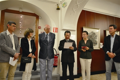 中国美协副主席许钦松与瑞士联邦前总统帕斯卡尔·库什潘等法、瑞两国友人参加“勃朗峰之夏——纪念中法建交50周年当代中国画作品展”开幕式。
