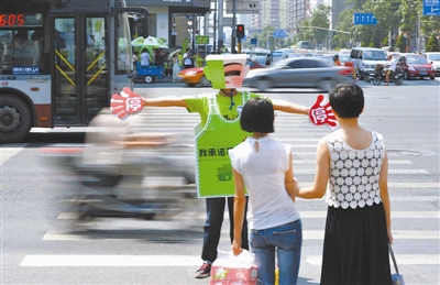 2014年7月8日,北京,“我承诺不闯红灯”系列公益活动启动,朝阳区计划在朝阳路红庙路口至青年路路口打造本市第一条“零”闯红灯示范路。沿线7个路口、21条人行横道,将通过早晚高峰志愿者执勤示范劝阻行人闯红灯。上午,记者发现,志愿者刚一离开,就有人“不自觉”。