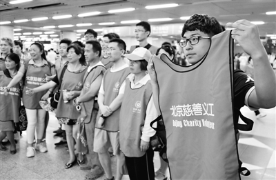 7月10日,参加助力暑运的义工们在西客站内举行启动仪式。当日,由北京市慈善义工协会举办的助力暑运北京西客站帮扶活动启动。此次义工活动从7月10日开始,将持续到8月31日,先后将有5000多人次的义工投入北京西客站,为暑运期间进出北京的旅客提供义务指路、义务疏导、义务禁烟、义务帮扶等服务工作。 新华社记者 李欣摄