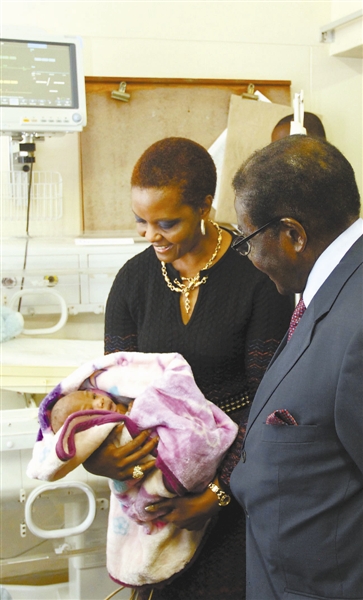 7月10日,在津巴布韦哈拉雷中心医院,津巴布韦总统穆加贝(右)和第一夫人格蕾丝看望手术后的婴儿。