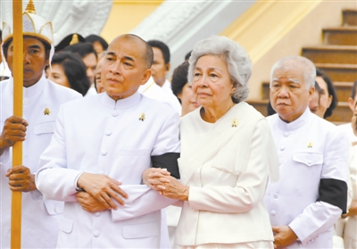 7月11日,柬埔寨已故太皇西哈努克的骨灰安奉仪式在柬埔寨首都金边举行,柬埔寨国王西哈莫尼(前左)、王太后莫尼列(前右),柬埔寨首相洪森等共同参加了安奉仪式。此次骨灰安奉仪式是依照佛教与柬埔寨王家礼仪,将西哈努克太皇的骨灰从王宫的佛塔移置到王宫内的王室灵塔,完成西哈努克太皇骨灰的最终安放。