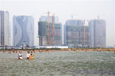 辽宁东戴河新区所属于葫芦岛市绥中县。一出山海关就是绥中,因此,绥中又被称为“关外第一城”。绥中靠海,如今,许多城市缺水,夏天干旱燥热,让人酷热难耐,因此,海让人感到亲切。开发商最了解客户的心理,于是,几乎无一例外地打“海牌”。6月16日、17日,记者在东戴河新区采访时看到,道路两旁的各式广告,都在向你传递着一个信息:他们建的是海景房。“一步亲海、私享沙滩”、“地标建筑、观山阅海”、“在海边撒欢儿,让海时光尽情尽兴”、“早上看海享海,中午玩海闹海,晚上赶海听海”……记者以买房者身份进到佳兆业东戴河的园区内,在园区四处眺望,你会由衷地赞叹:太美了!薰衣草、灌木丛围绕着楼群,清澈的湖水上架着曲径通幽的小桥,华清池泳池、秦皇汉武娱乐会所、阳光沙滩、沙鸥岛、银帆广场、林中氧吧、听涛园、迷迭香径、芝径云堤,既有园区内的人工景观,又可观海、听海。记者又走访了山海同湾、海韵馨园等多个小区发现,整洁的道路、干净的楼房,新建的设施和合理的布局,整个东戴河新区呈现出一片“美景” 。