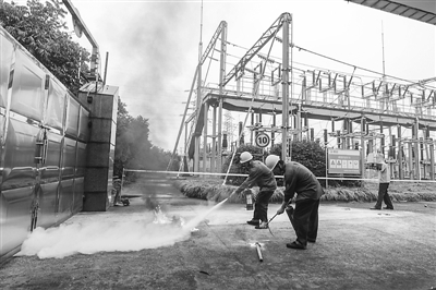 日前在浙江省杭州市萧山区220千伏宁围变电站,萧山公安巡特警大队与国网杭州市萧山区供电公司等多部门开展一场反恐防暴演练,以提升变电站工作人员的反恐防暴意识和技能,建立有效的应急协调联动机制。图为变电站工作人员用灭火器及时将扔进围墙的燃烧瓶扑灭。
