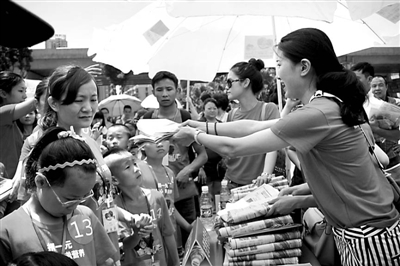 7月13日,爱心志愿者在领取报纸、足球等义卖物品。