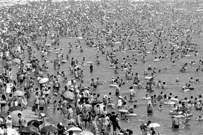 7月13日,暑期旅游高峰的第一个双休日,青岛各个海水浴场、崂山、海底世界等景点全面迎来暑期旅游高峰。在青岛第一海水浴场,游客大军“攻陷”沿海浴场,下海冲凉的游客如同“下饺子”。
