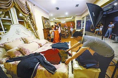 7月14日,客户在整理即将拍摄的服装,拍摄旺季一个模特一天的服装拍摄量可以达到一两百件。