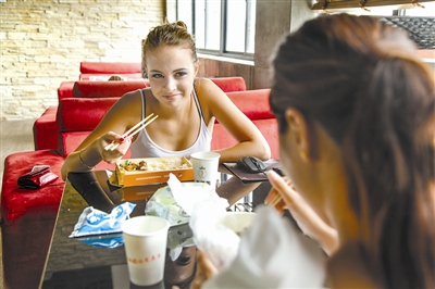 7月14日,来自斯洛伐克的女模特帕特丽萨在拍摄间歇与工作人员一起吃工作餐。