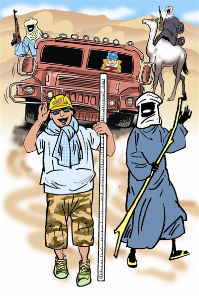 当小伙子们奔波了近2000公里从索拉兹返程时,资料收集齐全,地形地貌了然于胸,并且多了一帮当地黑人朋友,考察时间是短暂的,但留在他们心中的或许是永远的,见识了广袤的沙漠戈壁,也见到了热情的当地人和他们心中的希望,见识了高温酷热,也见到了勃勃生机。(漫画 法明)