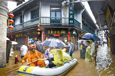 7月15日,救援人员在凤凰古城开展抢险救援。