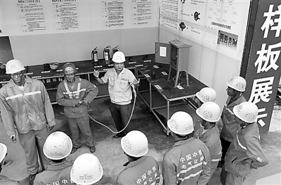 7月12日,在位于郑州市的郑机城际铁路工地上,中铁电气化局西铁工程公司项目安质部长邓旭辉在安全“样板间”里向农民工演示安全带的正确使用方法。安全“样板间”里展示的“模特”及模型直观、形象,引起工人的极大兴趣,大大提高了一线工人的安全操作意识。焦宏涛 摄