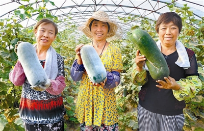 7月15日,河北省永清县美盛航天蔬菜种植示范基地工人展示太空育种特大节瓜。