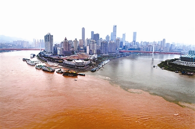 7月11日,重庆朝天门港的长江(左)、嘉陵江交汇处泾渭分明。