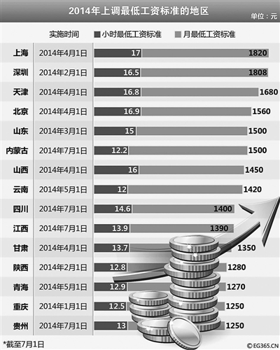 进入7月,四川、江西、贵州和内蒙古均上调了最低工资标准。据不完全统计,截至目前,2014年全国已有15个地区上调了最低工资标准。从绝对数看,上海的月最低工资标准和小时最低工资标准最高,分别为1820元和17元。 CFP供图