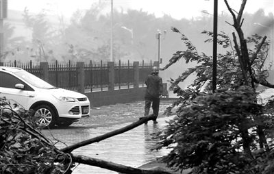 7月18日,强台风将海口市海甸岛的树木刮倒。