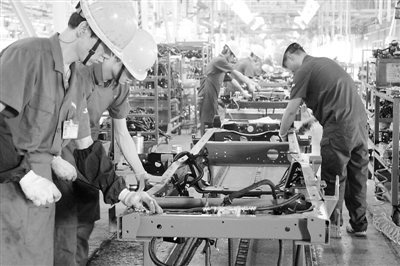 轰鸣的机器声中,底盘预装线、内饰线、装配主线和发动机预装线四条流水线上的工人们在各自的工作面上紧张地忙碌着。